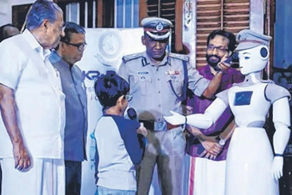 திருவனந்தபுரம் தலைமைக் காவல் நிலையத்தில் உள்ள காவல்துறை 'ரோபோ' பொதுமக்களை வரவேற்று, பொதுவான சந்தேகங்களுக்கு பதில் அளித்து வழிகாட்டுகிறது. படம்: தமிழக ஊடகம் -