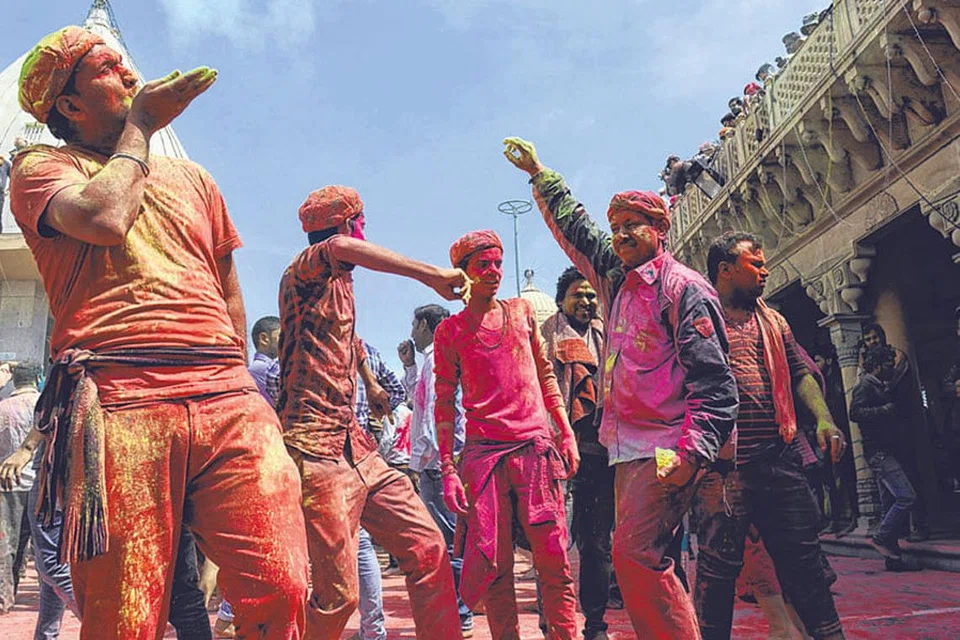 வசந்த காலத்தை வரவேற்கும் ஹோலிப் பண்டிகை வரும் 20, 21 தேதிகளில் கொண்டாடப்பட உள்ளது. அதற்கு முன்னதாகவே வடமாநிலங்களில் ஹோலி பண்டிகை உற்சாகமாக கொண்டாடப்பட்டு வருகிறது. ஒருவர் மீது ஒருவர் வண்ணப்பொடிகளை தூவியும் நடனமாடியும் தங்களது மகிழ்ச்சியை வெளிப்படுத்தி வருகின்றனர். உத்தரப்பிரதேச மாநிலம் மதுராவில் லத்மார் ஹோலி மிகவும் விமரி சையாகக் கொண்டாடப்பட்டது. படம்: ஏஎஃப்பி