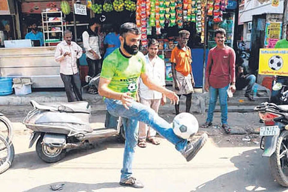 மத்திய சென்னை தொகுதி சுயேச்சை வேட்பாளர் சுரேஷ்பாபு தனக்கு ஒதுக்கப்பட்ட காற்பந்துச் சின்னத்துடன் வாக்கு சேகரித்து வருகிறார். அத்தொகுதியில் தயாநிதி மாறன் (திமுக), சாம் பால் (பாமக) உள்ளிட்டோர் களத்தில் உள்ளனர். படம்: தமிழக ஊடகம்