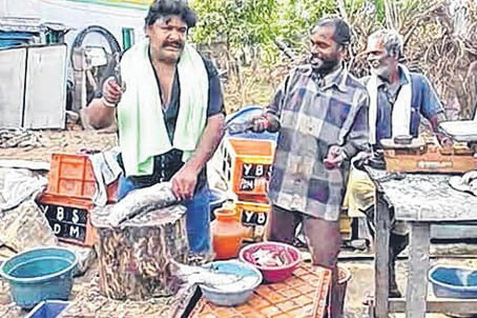 மீன்களை வெட்டி வாக்கு சேகரித்த மன்சூர் அலிகான். படம்: ஊடகம் -