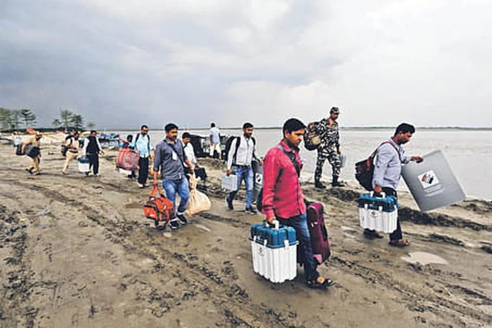 இந்தியாவின் வடகிழக்கு மாநிலமான அசாமிற்கு படகு மூலம் நேற்று வந்து இறங்கிய தேர்தல் அதிகாரிகள் மின்னியல் வாக்கெடுப்பு இயந்திரங்களைத் தூக்கிச் செல்கின்றனர். படம்: ராய்ட்டர்ஸ்
