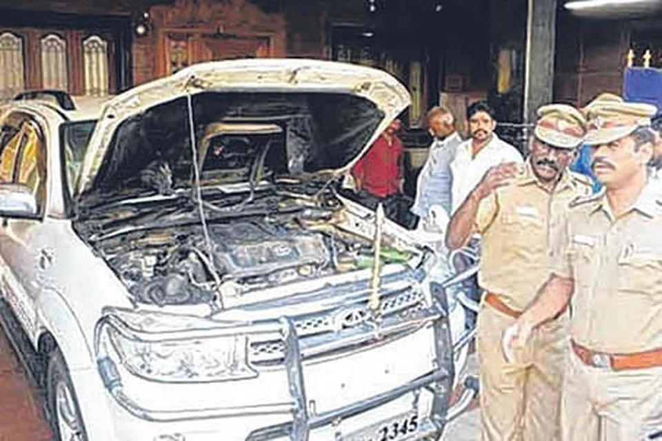 சென்னை அண்ணாநகர் திமுக பகுதி செயலாளர் பரமசிவம் என்பவரின் வீடு டி.பி.சத்திரத்தில் உள்ளது. வியாழக்கிழமை இரவு அவரின் வீட்டில் மர்ம நபர்கள் பெட்ரோல் குண்டை வீசியதில் கார் சேதம் அடைந்தது. பரமசிவம் அளித்த புகாரின் பேரில் போலிஸ் வழக்குப் பதிவு செய்தது. விசாரணை நடக்கிறது. படம்: தமிழக ஊடகம்