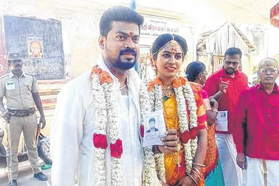 புதுச்சேரியில் நாடாளுமன்றத் தேர்தல் மற்றும் தட்டாஞ்சாவடி இடைத்தேர்தலில் திருமணம் முடிந்த கையோடு தட்டாஞ்சாவடி தொகுதிக்குட்பட்ட குண்டுபாளையம் வாக்குச்சாவடி மையத்தில் செல்வகுமார் மற்றும் தீபா என்ற மணமக்கள் தங்கள் சுற்றம் சூழ வந்து வாக்களித்தனர். படம்: ஊடகம்