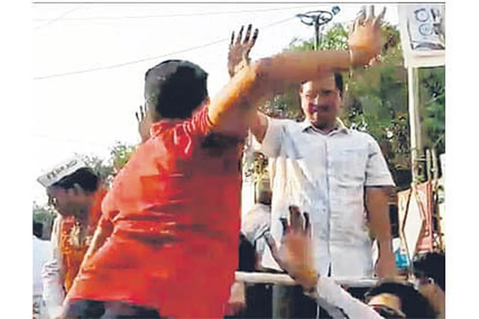 அப்போது சிவப்புச் சட்டை அணிந்த ஒருவர் திடீரென ஜீப் மீது ஏறி கெஜ்ரிவால் கன்னத்தில் அறைந்தார். இதனால் அதிர்ச்சி அடைந்த கெஜ்ரிவால் சரிந்து விழுந்தார்.