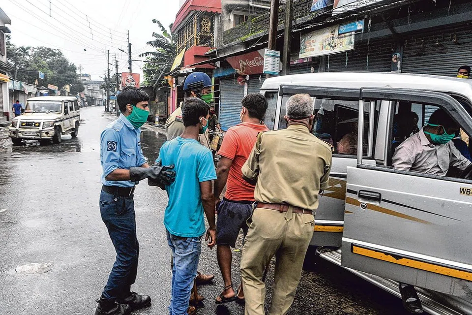 மேற்கு வங்காள மாநிலம் சிலிகுரி நகராட்சி வட்டாரத்தில் கிருமிப் பரவலைத் தடுக்கும் முயற்சியாக ஊரடங்கு உத்தரவு மீண்டும் பிறப்பிக்கப்பட்டு கடுமையாகக் கண்காணிக்கப்பட்டு வருகிறது. இந்நிலையில் ஊரடங்கு விதிகளை மீறிய சிலரை துரத்திப் பிடித்த போலிசார் அவர்கள் அத்தனை பேரையும் கைது செய்து விசாரணைக்கு அழைத்துச் சென்றனர். படம்: ஏஎஃப்பி