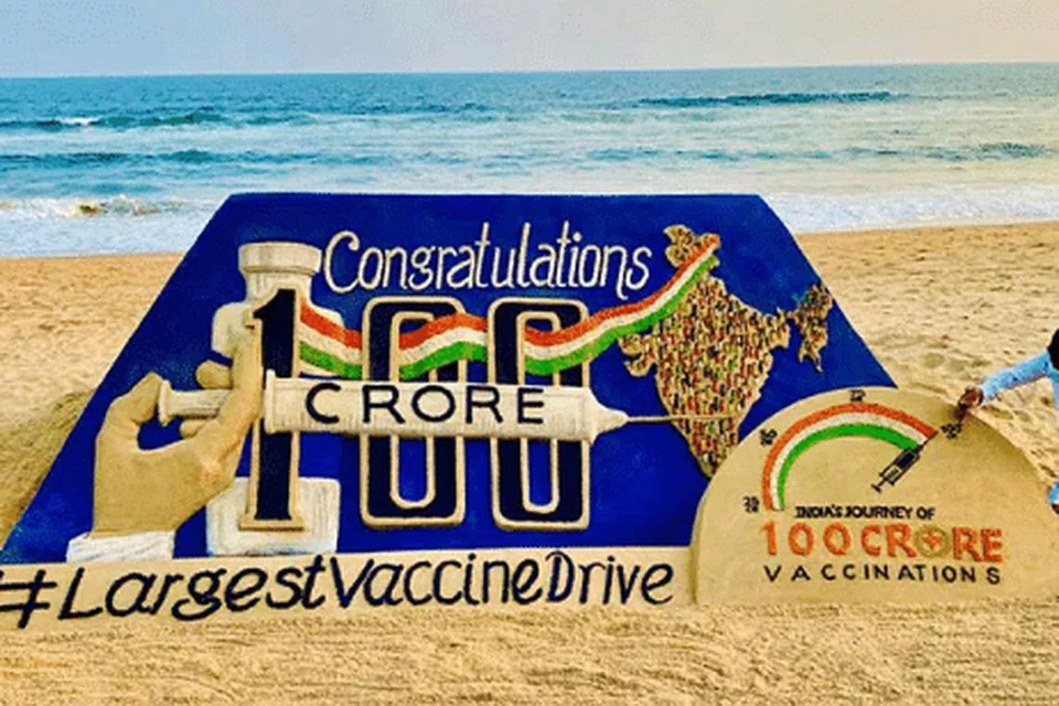 கடலைப் பின்னணியாகக் கொண்ட வண்ண ஓவியம், இந்தியாவின் வரைபடத்தையும் கொவிட் தடுப்பூசியையும் காட்டுகிறது. "வாழ்த்துக்கள்", "இந்தியாவின் 100 கோடி தடுப்பூசியை நோக்கும் பயணம்" என அந்த மணற்சிற்பத்தில் எழுதப்பட்டது.
