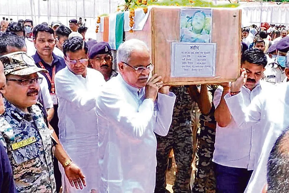 முதல்வர் பூபேஷ் பாகல் இறுதிச் சடங்கில் கலந்துகொண்டு வீரரின் உடல் இருந்த சவப்பெட்டியை தன்னுடைய தோளில் தூக்கிச் சென்றார்.