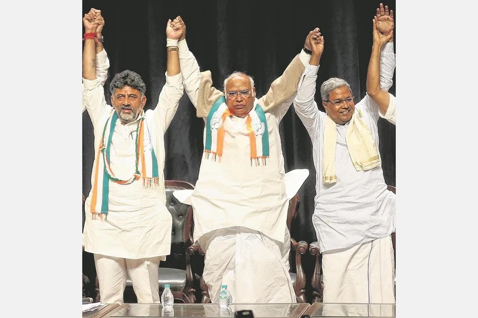 தேர்தல் முடிவுகள் வெளியான பிறகு வெற்றியைக் கொண்டாடும் விதமாக நடைபெற்ற கூட்டத்தில் (இடமிருந்து) கர்நாடக மாநில காங்கிரஸ் தலைவர் டி.கே.சிவக்குமார், அகில இந்திய காங்கிரஸ் தலைவர் மல்லிகார்ஜுன கார்கே, முன்னாள் முதல்வர் சித்தராமையா. படம்: இந்திய ஊடகம் -
