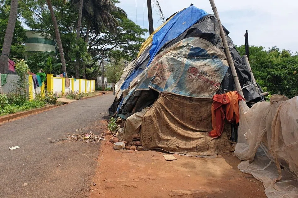 படுதா, தார்பாய், சுவரொட்டி, துணிமணிகளைக் கொண்டு மூடப்பட்டு இருக்கும் அந்த வீட்டில்தான் இத்தம்பதியர் குடியிருக்கிறார்கள். வீட்டில் மின்சாரம் கிடையாது. தண்ணீர் கிடையாது. வீட்டிற்குக் கதவும் கிடையாது.