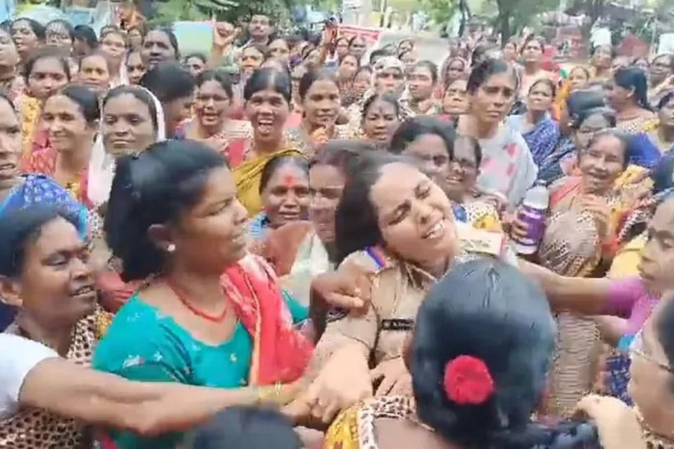 தெலுங்கானா: தெலுங்கானாவில் அங்கன்வாடி ஊழியர்களிடம் அகப்பட்டுக்கொண்ட பெண் காவல் அதிகாரி அனைவரையும் சமாளித்து ஆர்ப்பாட்டத்தை ஒடுக்கினார்.