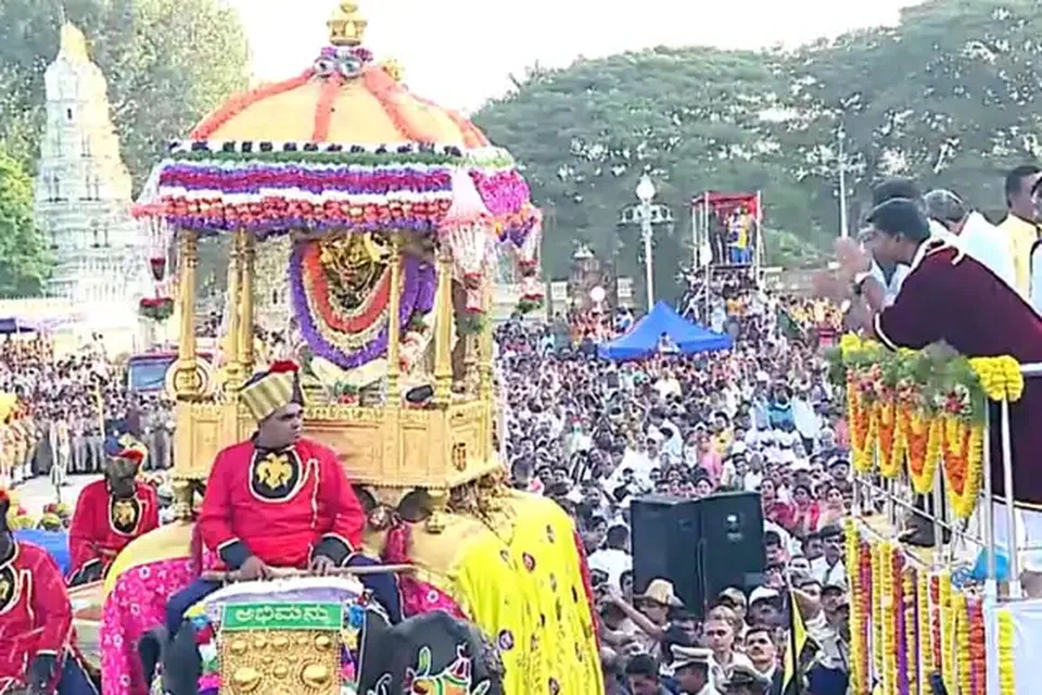 அபிமன்யூ யானை சாமுண்டீஸ்வரி அம்மன் வீற்றிருக்கும் 750 கிலோ எடையுள்ள தங்க அம்பாரியை சுமந்து ஊர்வலமாக சென்றது.