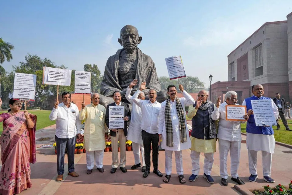இந்நிலையில் அந்த நாடாளுமன்ற உறுப்பினர்கள் வெள்ளிக்கிழமை காலையில் இருந்து நாடாளுமன்ற வளாகத்தில் உள்ள காந்தி சிலை முன்பு ஆர்ப்பாட்டத்தில் ஈடுபட்டனர்.