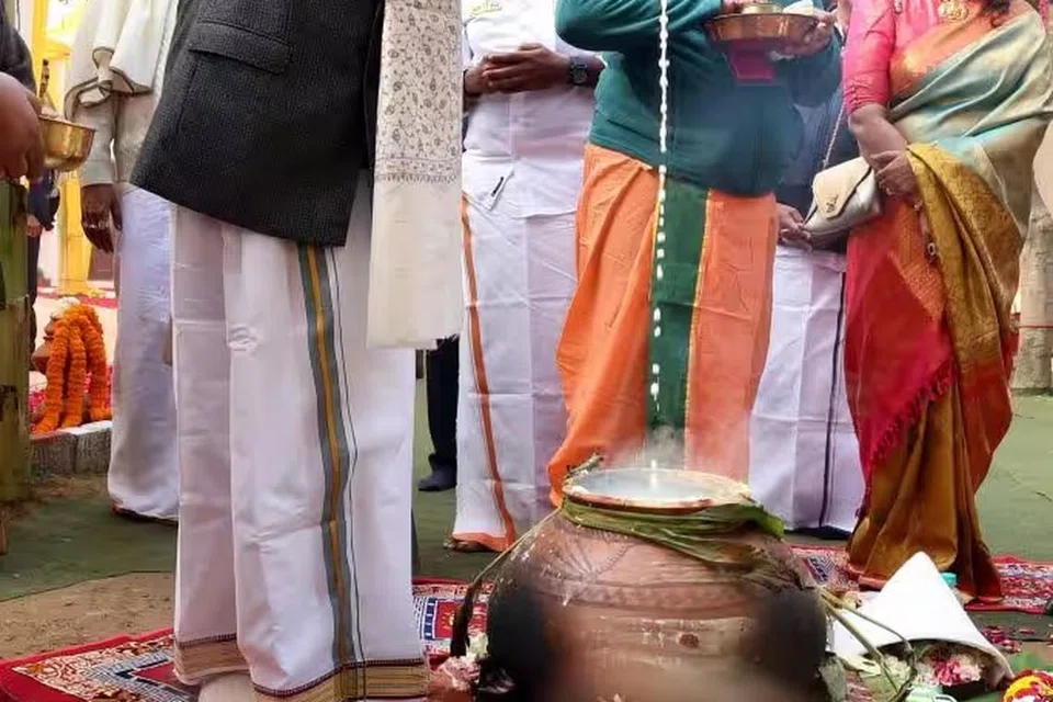 புது மண்பானையில் அமைச்சர் எல்.முருகன், அவரது மனைவி ஆகியோர் பொங்கல் வைத்தனர். பிரதமர் மோடி பச்சரிசியை பானையில் போட்டு, பால் ஊற்றினார். பொங்கல் பொங்கியதும் ‘பொங்கலோ பொங்கல்’ என உற்சாகமாக அனைவரும் குரல் எழுப்பினர்.