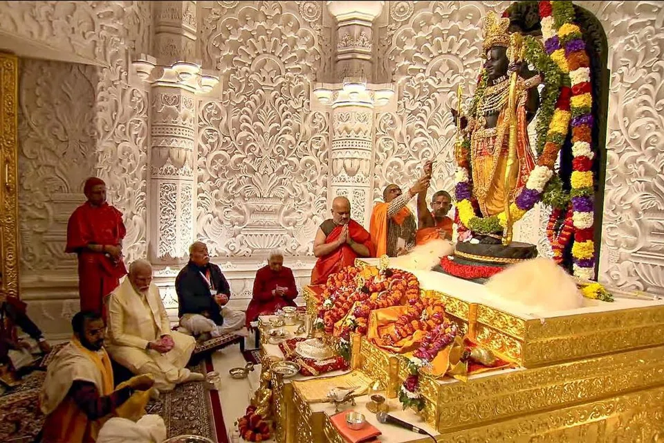ராமர் கோயில் திறப்பு விழாவின் முக்கிய நிகழ்வான பால ராமர் நிறுவப்படுதல் திங்கட்கிழமை இந்திய நேரப்படி நண்பகல் 12.29.08 வினாடிக்கு 121 வேதகர்கள் வேத மந்திரம் முழங்க நடைபெற்றது.