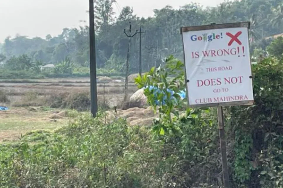 ‘கூகல் சொல்வது தவறு. இந்தச் சாலை கிளப் மகிந்திராவுக்குக் போகாது’ என்று அந்தப் பலகையில் எழுதப்பட்டிருந்தது.