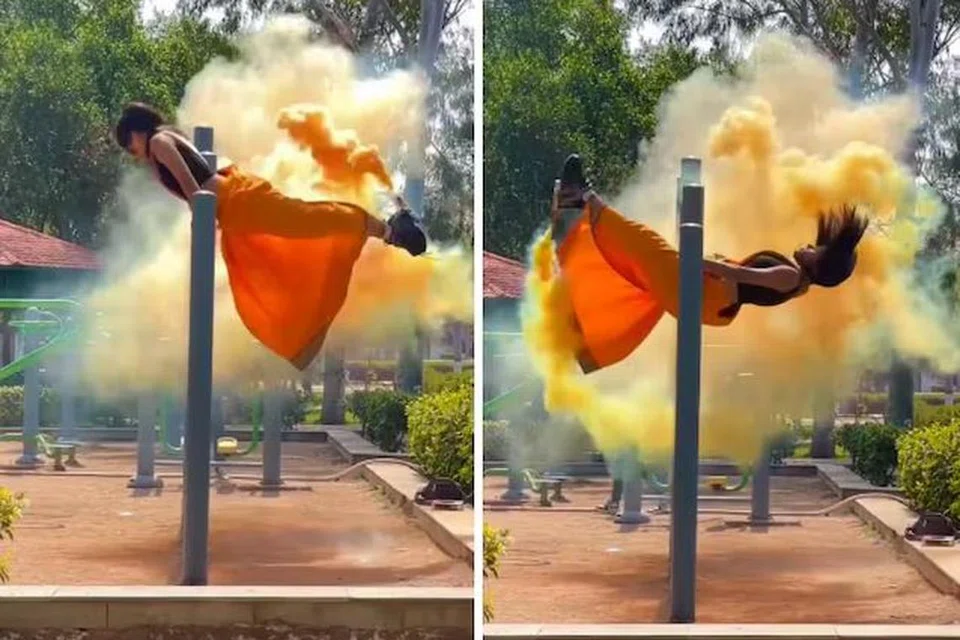அவ்வாறு காணொளி தொடங்கும்போது, தனது காலணிகளில் ஹோலி பட்டாசுகளைக் கட்டியிருந்த பெண், இரும்புக் கம்பத்தில் தயாராக இருந்தார்.