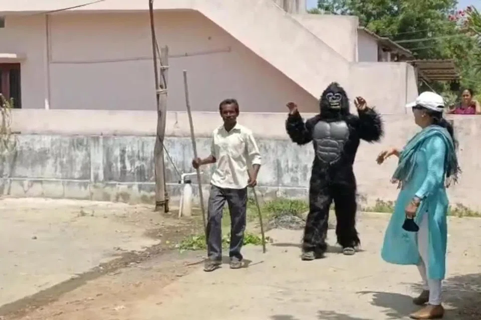 ஊராட்சியில் வேலை செய்யும் ஊழியர்களுக்கு என்றே கொரில்லா உடை வாங்கப்பட்டுள்ளது. அவற்றை அணிந்துகொண்டு வரும் ஊழியர்களைப் பார்க்கும் குரங்குக் கூட்டம் பெரிய கொரில்லா வந்துள்ளதாக நினைத்து அங்கிருந்து ஓட்டம் பிடிக்கின்றன.