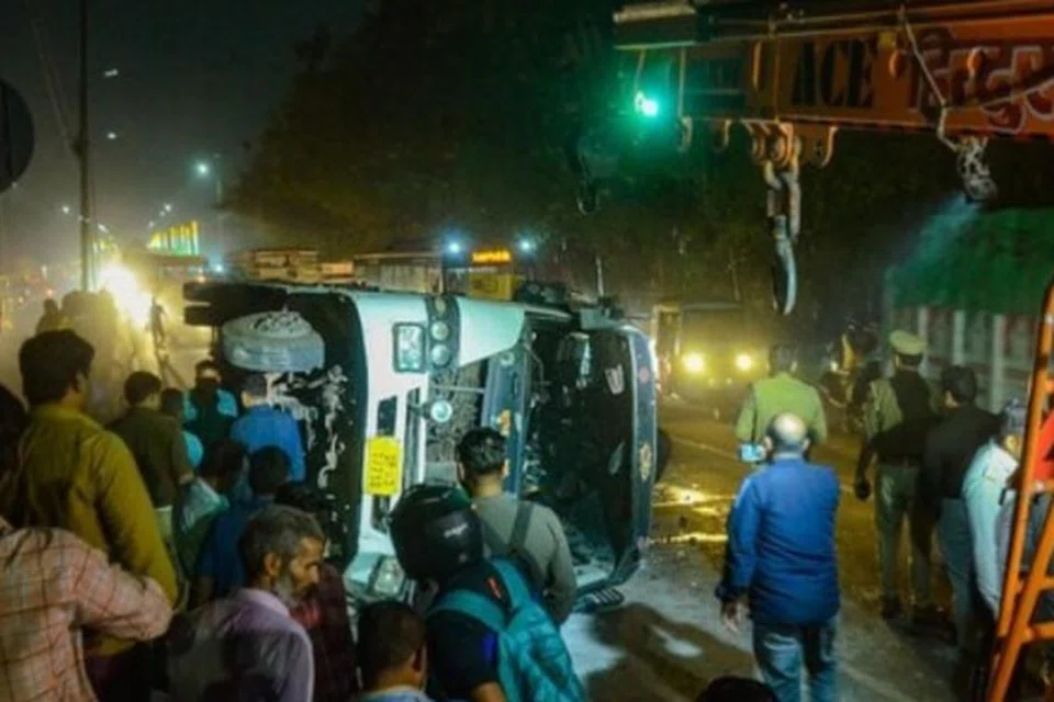 இரவு 11.10 மணியளவில் கல் ஏற்றிக்கொண்டு வேமாக வந்த டிப்பர் லாரி ஒன்று கட்டுப்பாட்டை இழந்து பேருந்தின் மீது மோதியது. அதில் பேருந்து ஒருபக்கமாகக் கவிழ்ந்தது.