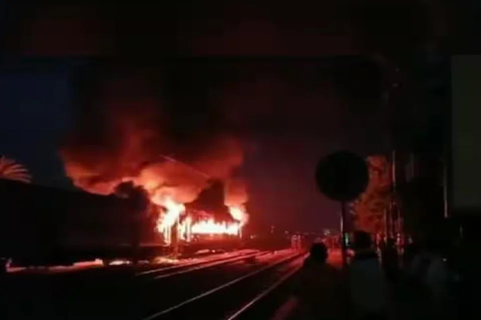 ஹரியானா மாநிலம் பானிபட்டில் இருந்து நிலக்கரி ஏற்றிக்கொண்டு உத்தரப் பிரதேச மாநிலத்தில் உள்ள வாரணாசிக்கு சென்றுகொண்டிருந்த சரக்கு ரயில் ஞாயிற்றுக்கிழமை இரவு திடீரென தீப்பிடித்தது.