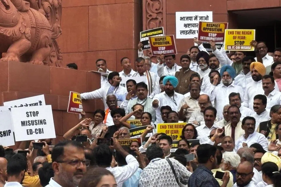 தொடர்ந்து நாடாளுமன்ற வளாகத்தில் எதிர்க்கட்சித் தலைவர் ராகுல் காந்தி தலைமையில் எம்.பி.க்கள் போராட்டம் நடத்தினர்.