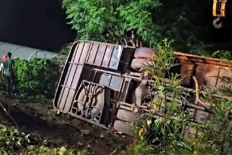 அந்த விபத்தில், கனரக வாகனம் சாலையில் இருந்து தடம்புரண்டு அருகே இருந்த பள்ளத்தில் கவிழ்ந்தது. பேருந்தில் பயணம் செய்த 42 பேரில் ஐந்து பேர் உயிரிழந்தனர். பலர் படுகாயமடைந்தனர். விபத்துக்குள்ளான கனரக வாகனம் மற்றும் பேருந்து ஆகியவற்றில் இருந்து பயணிகள் மீட்கப்பட்டு அருகே உள்ள மருத்துவமனையில் அனுமதிக்கப்பட்டுள்ளனர்.