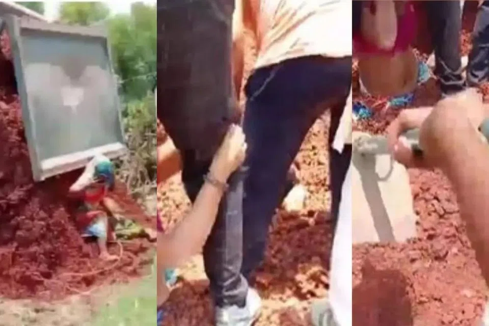 இதில், அவர்கள் கிட்டத்தட்ட முழுமையாக மண்ணில் புதைந்தனர். அருகில் இருந்த கிராம மக்கள் துரிதமாக செயல்பட்டு அவர்களை மீட்டனர். இந்தச் சம்பவம் தொடர்பாக வழக்கு பதிவு செய்யப்பட்டுள்ளது. இந்நிலையில் பெண்கள் மண்ணில் இருந்து மீட்கப்படும் காணொளி இணையத்தில் பரவலாகி வருகிறது.