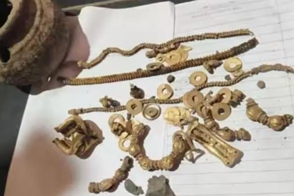 அதையடுத்து, பள்ளம் தோண்டச் சொன்ன கங்கவ்வா பசவராஜ் என்ற பெண்ணிடம் கொடுக்கப்பட்ட செம்பு பாத்திரத்தில் 475 கிராம் தங்க நகைகள் இருந்தன.