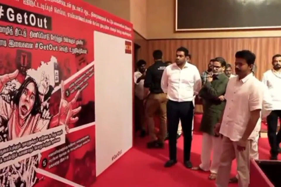 விழா மேடைக்கு அருகே வைக்கப்பட்டிருந்த மும்மொழி கொள்கை, மாநில, மத்திய அரசு ஆகியவற்றிற்கு எதிரான வாசகங்கள் அடங்கிய பதாகையில் கையெழுத்திட்டு, ‘கெட் அவுட்’ கையெழுத்து இயக்கத்தை விஜய் தொடங்கி வைத்தார்.