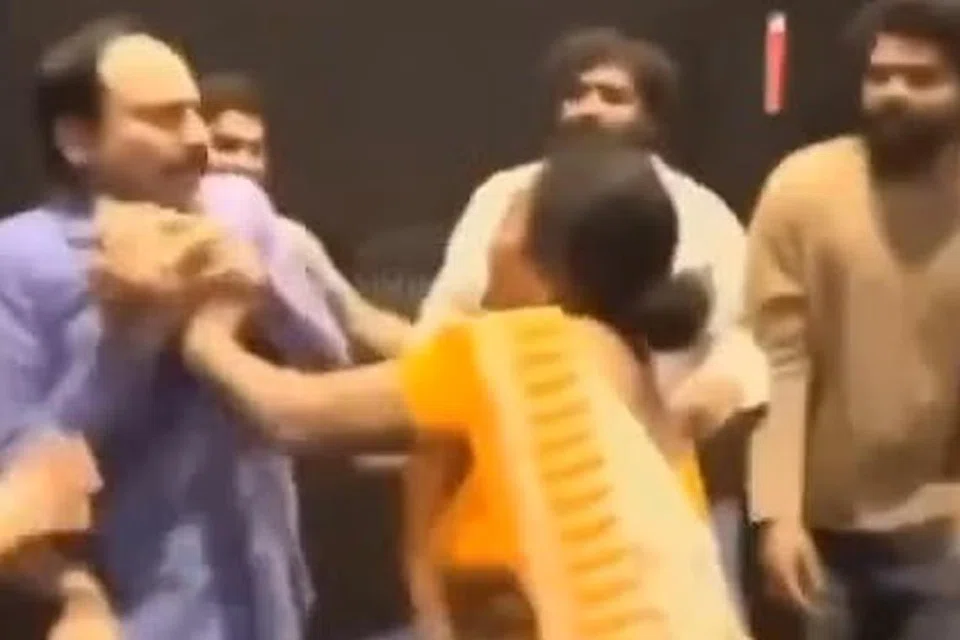 அப்போது, பார்வையாளர்கள் பகுதியிலிருந்து திடீரென மேடையில் பாய்ந்த பெண் ஒருவர், என்.டி. ராமசாமியை அடிக்கத் தொடங்கினார்.