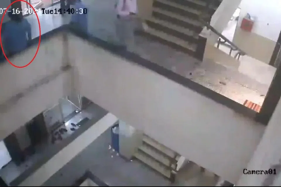 இன்னோர் ஆடவருடன் அந்த ஆடவர் மாடிப்படிவழி கீழே செல்வதையும் வழிப்போக்கர்கள் கீழே எட்டிப் பார்ப்பதையும் காணொளியில் பார்க்க முடிகிறது.