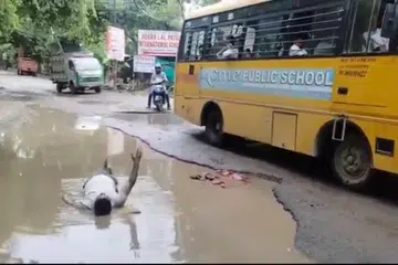 லக்னோ: குண்டும் குழியுமாக, மழைநீர் தேங்கியுள்ள சாலைகளைச் சீரமைக்கக் கோரி வியாபாரி ஒருவர் மேற்கொண்ட