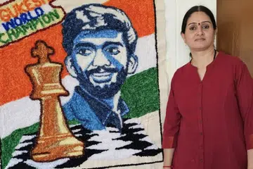 கோவை: இளம் வயதில் உலக சதுரங்க சாம்பியன் பட்டம் வென்ற டி.குகேஷின் உருவத்தை வண்ண நூலால் வரைந்து