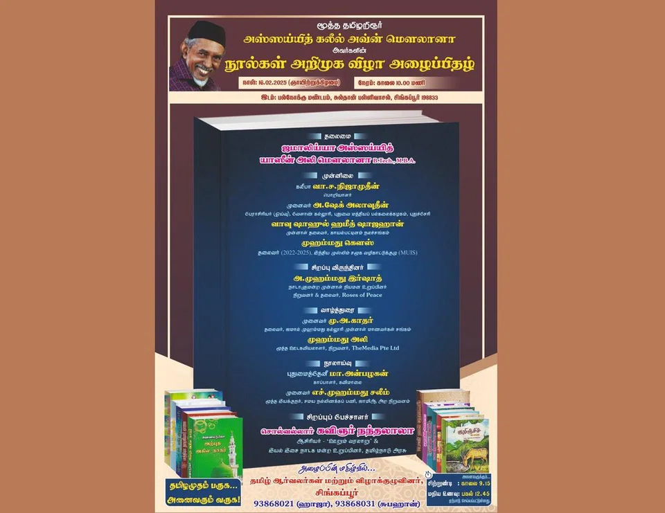 சிறந்த ஆய்வாளரும் மூத்த தமிழறிஞருமான அஸ்ஸய்யித் கலீல் அவ்ன் மௌலானா அவர்களின் 11 நூல்களின் அறிமுக விழா ஞாயிற்றுக்கிழமை (பிப்ரவரி 16) முற்பகல் நார்த் பிரிட்ஜ் சாலையில் அமைந்துள்ள மஸ்ஜித் சுல்தான் பன்னோக்கு மண்டபத்தில் நடைபெற உள்ளது.
