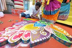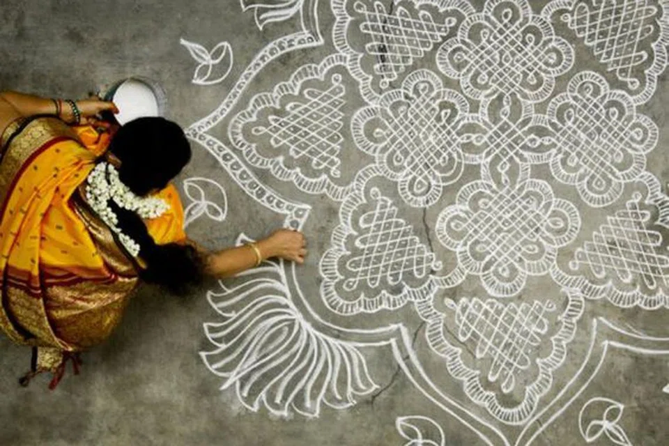 பாரம்பரிய முறையில் அரிசி மாவில் இடப்படும் கோலங்கள், இன்று கண்ணைக் கவரும் வண்ணங்களில் மிளிர்கின்றன. மங்கல நிகழ்ச்சிகளின்போது இடப்படும் அரிசி மாவுக் கோலம் எறும்புகள், பறவைகள் போன்ற உயிரினங்களுக்கு உணவாகவும் அமைகிறது.