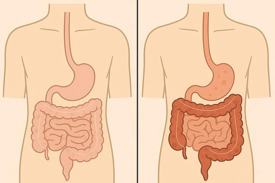 குடல் அழற்சி நோயால் (Inflammatory Bowel Disease) உணவுச் செரிமான உறுப்புகளான வயிற்றிலும் குடலிலும் வீக்கமும் பாதிப்பும் ஏற்படுகின்றன.