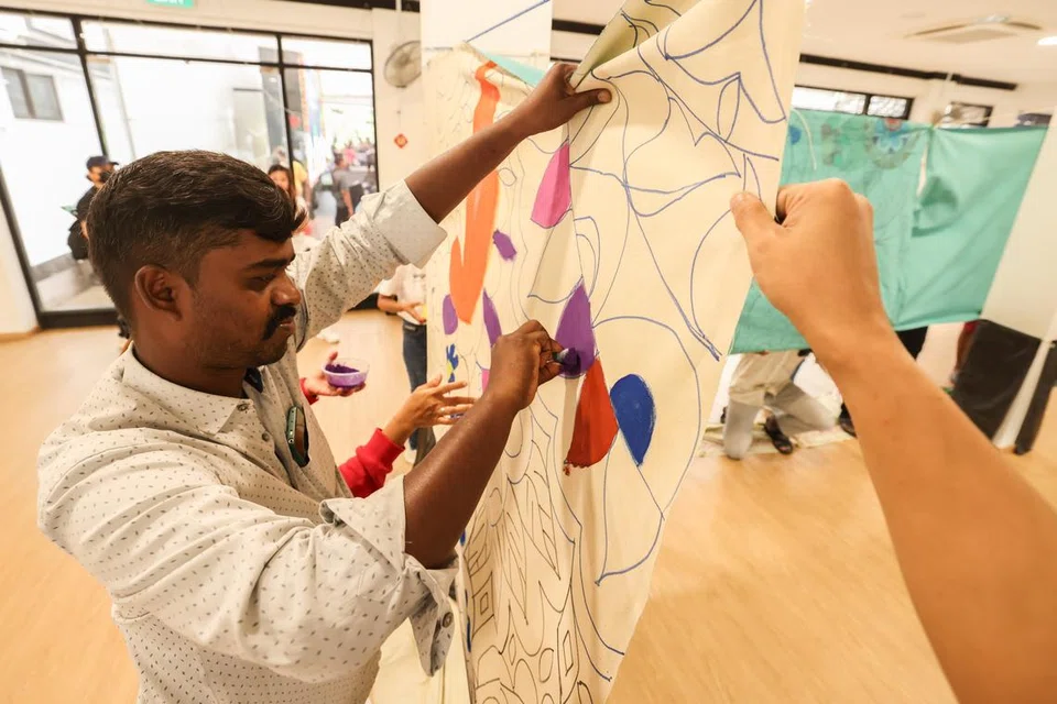வெளிநாட்டு ஊழியர்களை ஈடுபடுத்தும் வகையில் அவர்கள் ரங்கோலிக்கு வண்ணம் தீட்டி மகிழ்ந்தனர்.