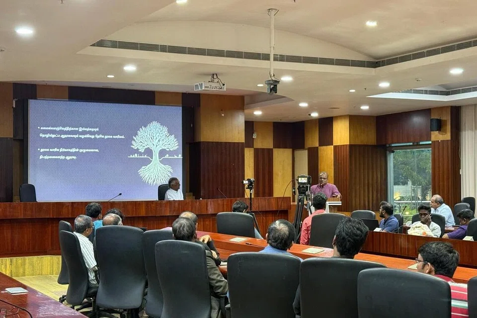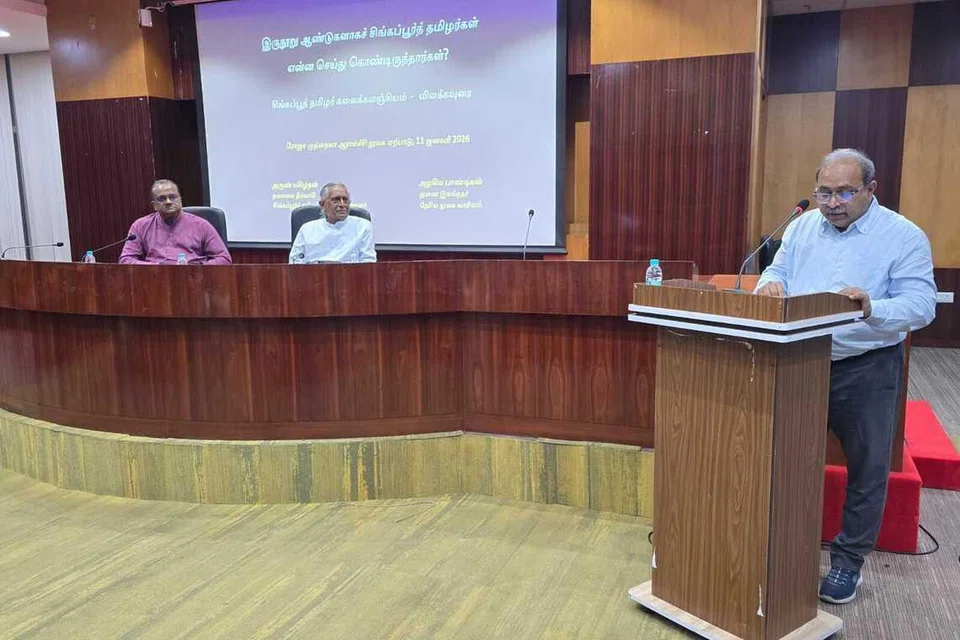 சிங்கப்பூர்த் தமிழர் கலைக்களஞ்சியம் பற்றி தமிழ்நாட்டில் திரு அருண் மகிழ்நன், திரு அழகிய பாண்டியன் விளக்கவுரையாற்றினர். - படம்: ரவி சிங்காரம்