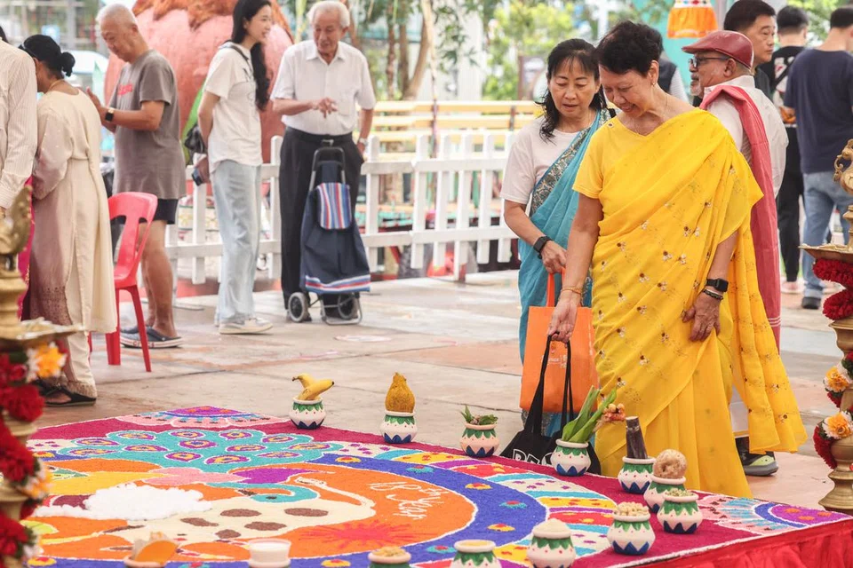 “முந்திய தினம் பகல் 3 மணி முதல் இரவு 10 மணி வரை கோலத்தைப் போட்டோம். மூன்று வாரங்களுக்கு முன்பே இதைத் திட்டமிட்டோம்,” என்றனர் கோலமிட்ட குழுவைச் சேர்ந்த இந்திரா, ஜீவனா, திவ்யா ஆகியோர்.