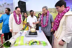நுழைவாயிலிலேயே வண்ணமயமான பெரிய கோலம் தென்பட்டது. அதன்மீது, வெல்லம், மஞ்சள்கொத்து, வெற்றிலைப் பாக்கு, தேங்காய், கரும்பு எனப் பொங்கலுக்குப் பயன்படும் மூலப்பொருள்கள் கொண்ட 18 மண்பானைகள் வைக்கப்பட்டிருந்தன.