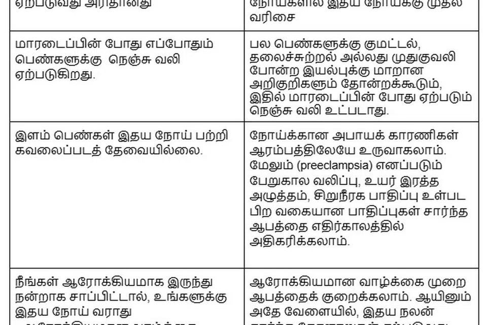 - ஆண்களுக்கு ஏற்படுவதுபோல கடுமையான இதய நோய் ஏற்படுவதற்கு முன்னரே மிதமான அறிகுறிகளுடன் பெண்களுக்கு மாரடைப்பு ஏற்படுவதாக மருத்துவ உலகம் கூறுகிறது.