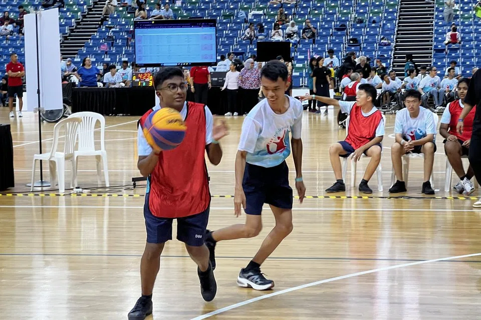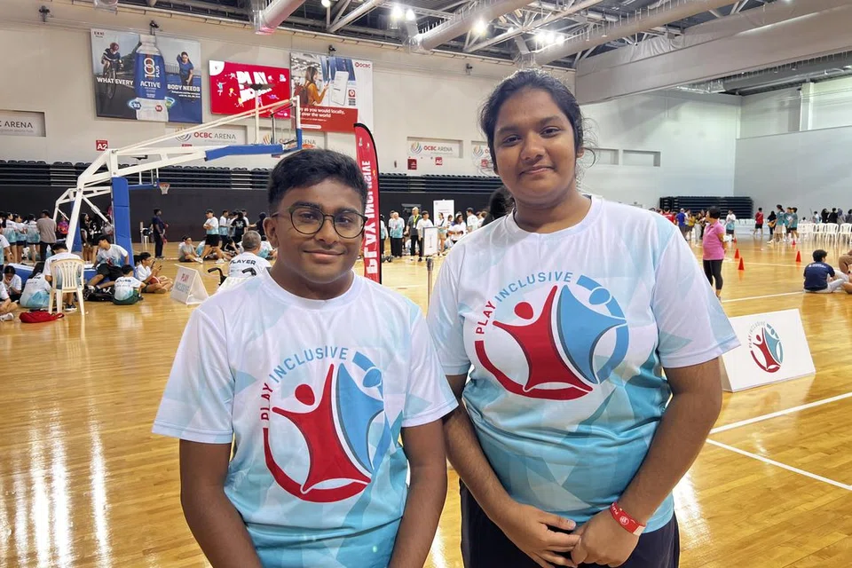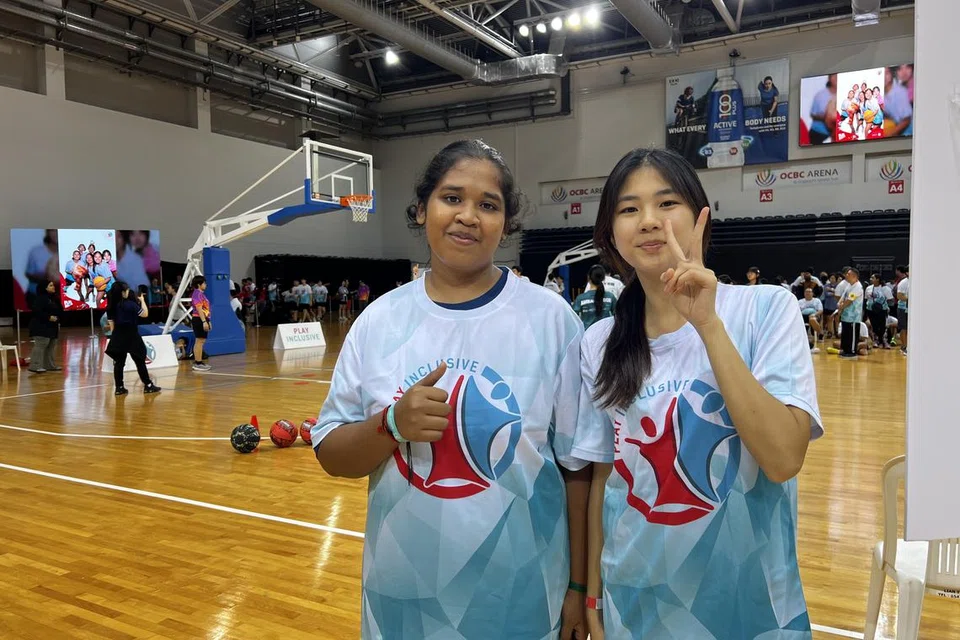 ‘ஏபிஎஸ்என் டெல்டா சீனியர் பள்ளி’ மாணவர் ராகவேந்திரன், 17, சிறப்புத் தேவை உள்ளவர். அவருடன் மிலெனியா கல்விநிலையத்திலிருந்து ஹர்ஷிதா கிருஷ்ணா, 18, கூடைப்பந்து விளையாட்டில் பங்கேற்றார்.