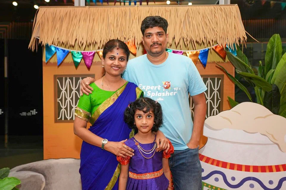 தமது கணவர் விஜய், ஏழு வயது மகள் சஹானா ஆராத்யாவுடன் வந்திருந்தார் சீமெய்வாசியான முத்து மாலதி,43.