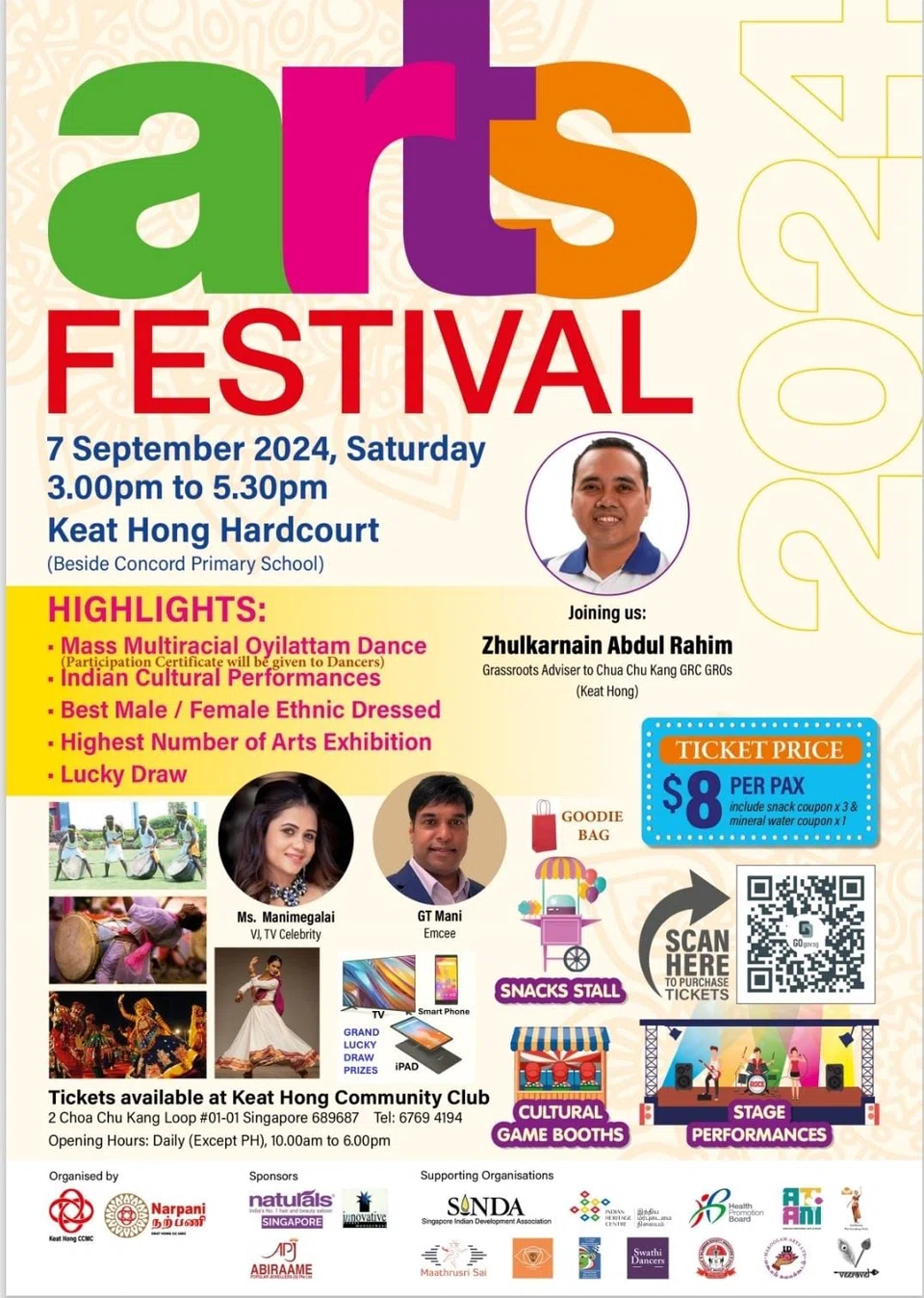 மூன்று உணவுப் பற்றுச்சீட்டுகளையும் ஒரு தண்ணீர்ப் பாட்டில் பற்றுச்சீட்டையும் உள்ளடக்கும் 8 வெள்ளி நுழைவுச்சீட்டுகளுக்கு 90183786 என்ற எண்ணில் தொடர்புகொள்ளலாம் அல்லது https://go.gov.sg/artfestival2024 என்ற இணையப்பக்கத்தில் பதிவுசெய்யலாம்.