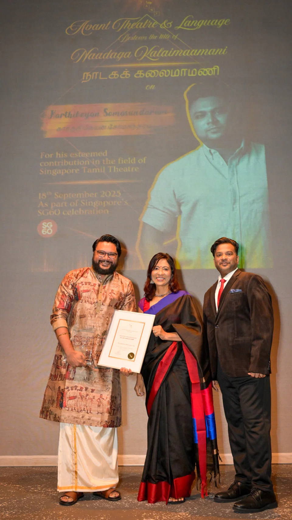 இவ்விருதைப் பெற்ற ஆக இளையவர், 1999லிருந்து மேடை நாடகங்களில் நடித்துவரும் கார்த்திகேயன் சோமசுந்தரம். “2015ல் இதே விருதை என் தந்தை திரு ரே சோமசுந்தரம் பெற்றார். என் தந்தை கலைகள்மீது காட்டிய காதல்தான் இன்றும் என்னை வழிநடத்துகிறது. அதிக இளையரை மேடை நாடகத்துக்கு அறிமுகப்படுந்துவதே என் மிகப் பெரிய நோக்கம்,” என்றார் திரு கார்த்திகேயன்.