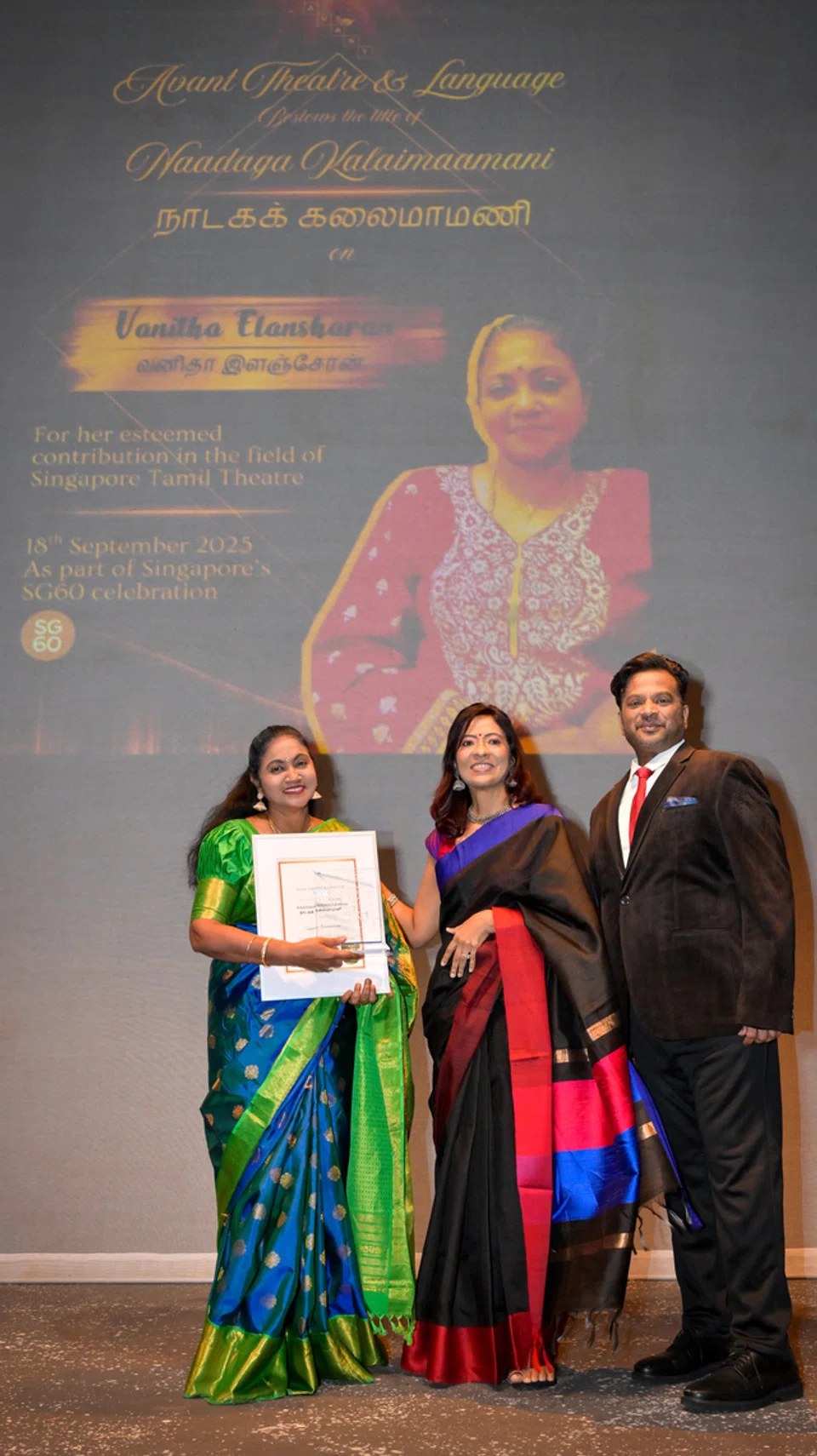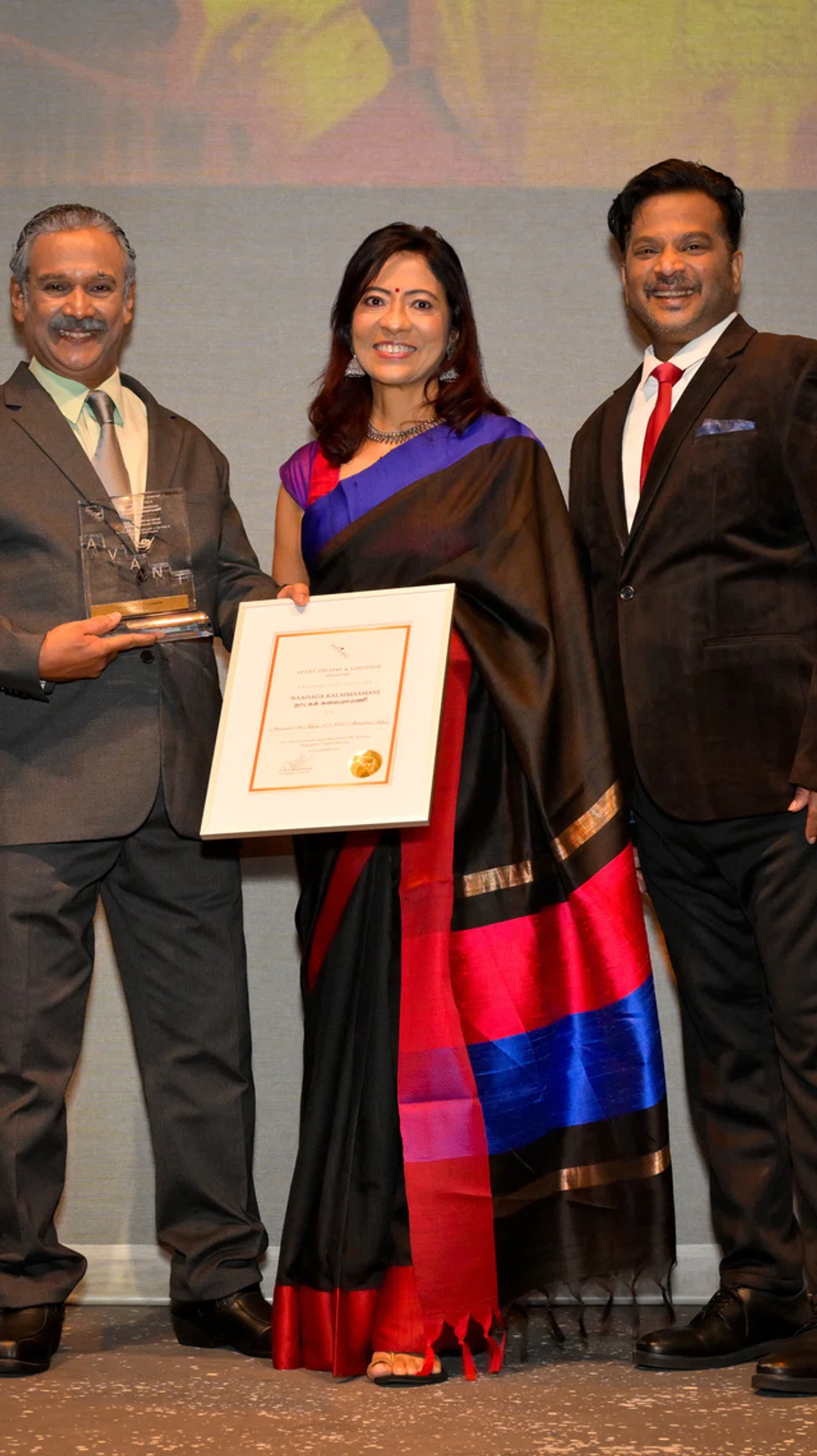 அவாண்ட் நாடகக் குழுவின் சார்பில் மீடியாகார்ப் நிறுவனத்தின் நிகழ்ச்சி நிர்வாக, சமூகத் தொடர்புப் பிரிவுத் தலைவர் சபநிதா சண்முகசுந்தரம் விருதுகளை வழங்கினார்.