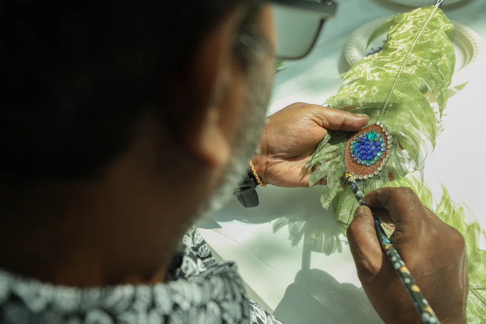 பொறுமையுடனும் துல்லியத்துடனும் பொருத்தப்பட்ட ஒவ்வொரு மணியும், மயிலிறகின் ‘கண்’ வடிவத்தை உருவாக்கியது.