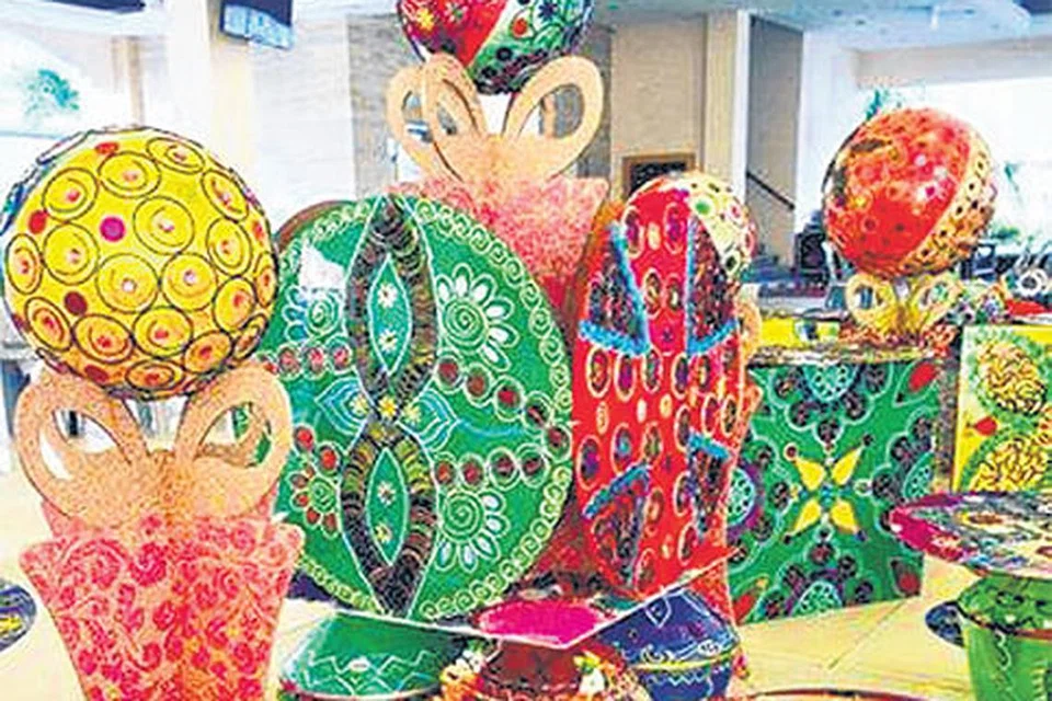 வண்ண வளையல்கள், 'அக்ரிலிக்' அட்டைகள், 'ஸ்டைரோஃபோம்' பந்துகள் ஆகியவற்றைக் கொண்டு உருவாக்கப்பட்ட ரங்கோலிகளை திருமதி விஜயா மோகன் (வலது மேல்படம்) ஏற்பாட்டில் பல இனத்தவர் இணைந்து உருவாக்கினர். படங்கள்: விஜயா மோகன்