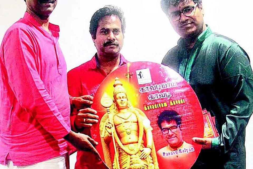 இடப்பறத்தில் 'காவடியாம் காவடி' பாடலாசிரியர் திரு தாம் சண்முகம், நடுவில் இசை அமைப்பாளர் திரு விஜய் சங்கர், வலப்புறத்தில் பக்தி இசைப் பாடகர் பரசு கல்யாண். படம்: திரு தாம் சண்முகம்