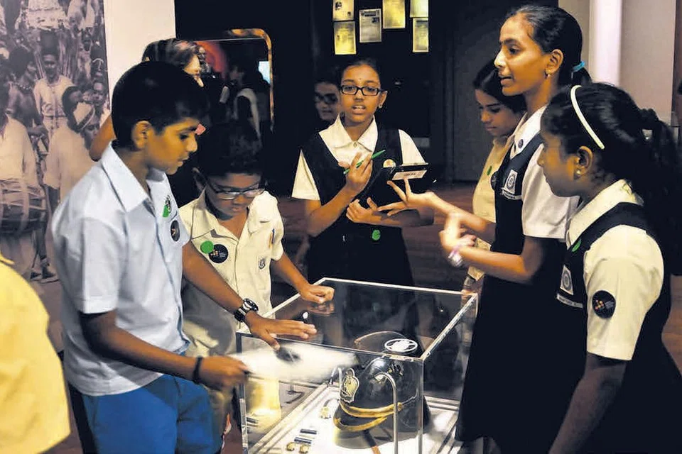 இந்திய மரபுடைமை நிலையத்தில் இருந்த பழமையான பொக்கிஷத்தைக் கண்டு அதனைப் பற்றி விவாதிக்கும் மாணவர்கள். படம்: சிற்பிகள் மன்றம்