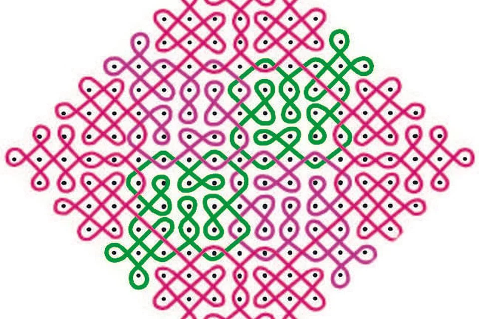 19-1 நேர்ப் புள்ளி வைத்து போடப்பட்டுள்ள இதுபோன்ற கோலங்களைப் போடத்தொடங்கியது முதல் கையை அதை முடிக்கும்வரை எடுக்காமல் கோலமிட வேண்டும் என்பது சவாலான ஒன்றாகும்.